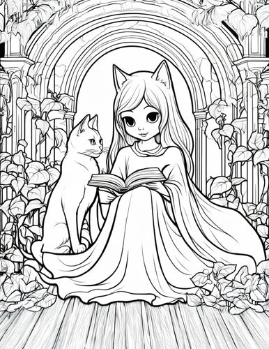 Free Printable Coloring Page Cute Cat Girl Reading to Her Cat