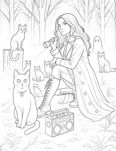 Free Printable Coloring Page Spooky Cat Lady Ghost Hunting With Her Cats
